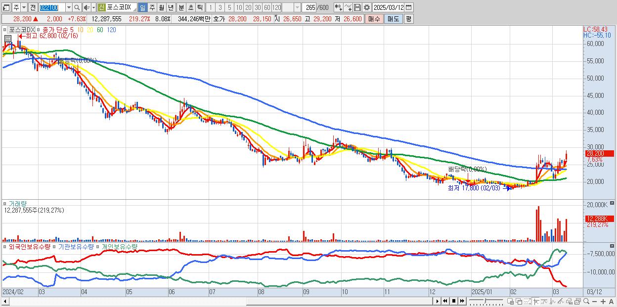 - 포스코DX (28,200원 ▲ 7.63% , 시총: 42,874억, 거래량: 12,287,555, 거래대금:3,442억)