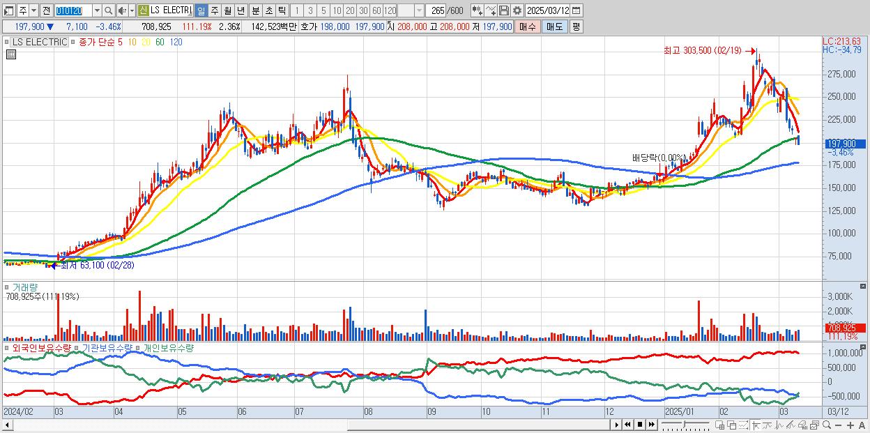 - LS ELECTRIC (197,900원 ▼ -3.46% , 시총: 59,370억, 거래량: 708,925, 거래대금:1,425억)