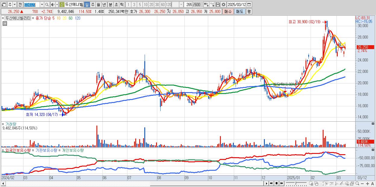- 두산에너빌리티 (26,250원 ▲ 2.74% , 시총: 168,147억, 거래량: 9,482,846, 거래대금:2,503억)
