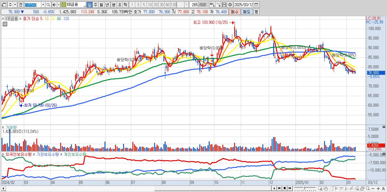 - KB금융 (76,900원 ▼ -0.65% , 시총: 302,623억, 거래량: 1,425,883, 거래대금:1,097억)