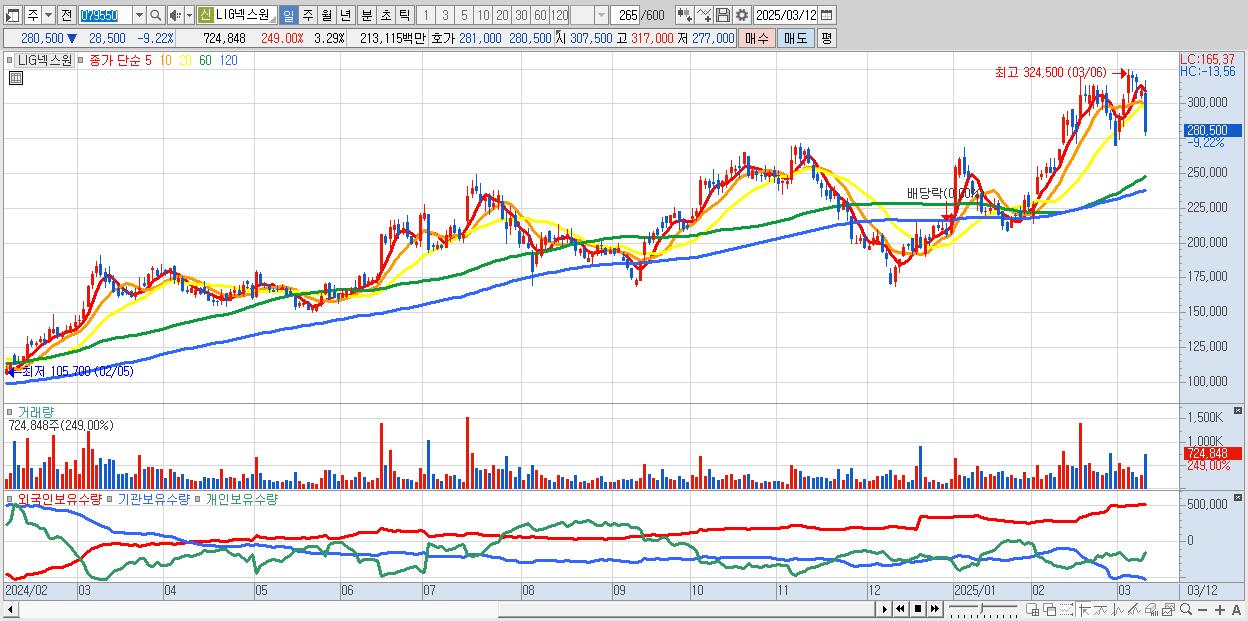 - LIG넥스원 (280,500원 ▼ -9.22% , 시총: 61,710억, 거래량: 724,848, 거래대금:2,131억)