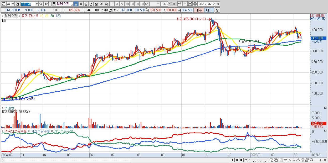 - 알테오젠 (361,000원 ▼ -2.43% , 시총: 192,481억, 거래량: 502,310, 거래대금:1,847억)