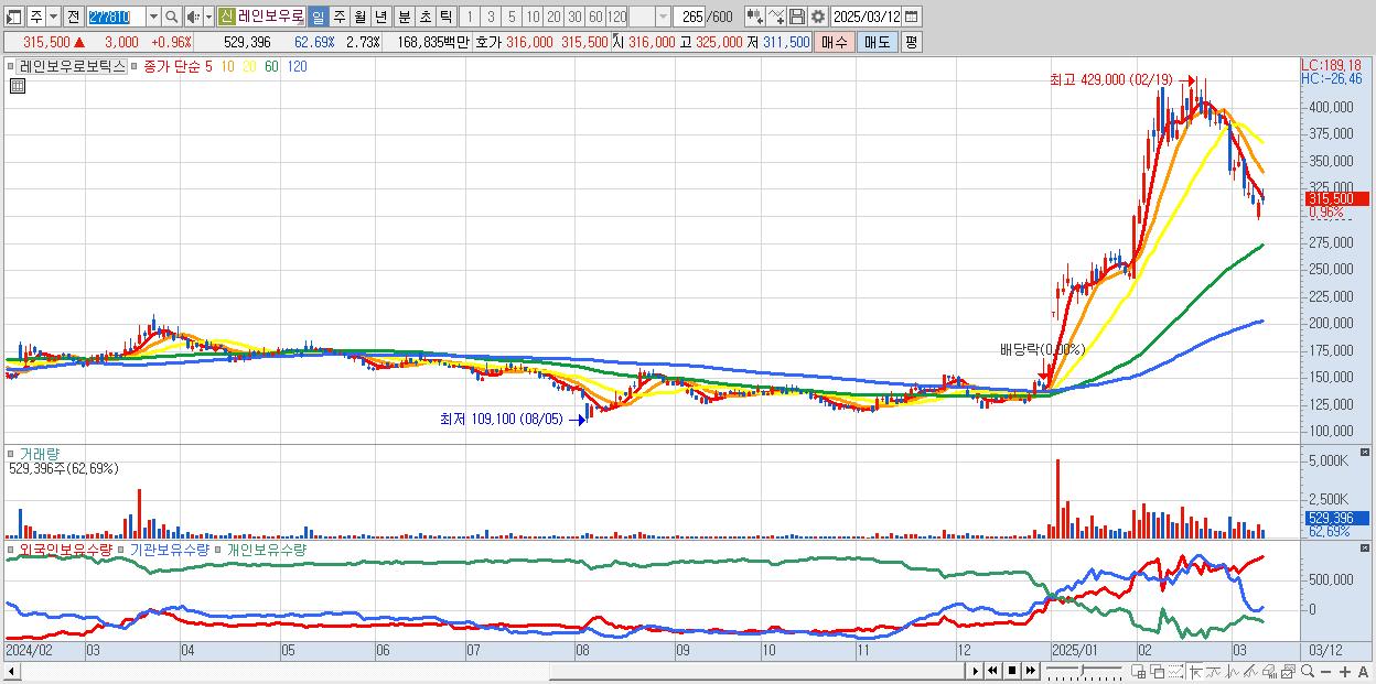 - 레인보우로보틱스 (315,500원 ▲ 0.96% , 시총: 61,207억, 거래량: 529,396, 거래대금:1,688억)