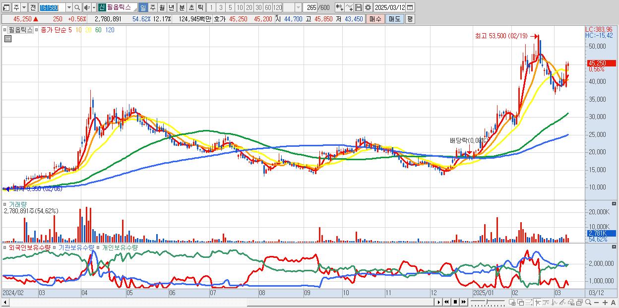 - 필옵틱스 (45,250원 ▲ 0.56% , 시총: 10,340억, 거래량: 2,780,891, 거래대금:1,249억)