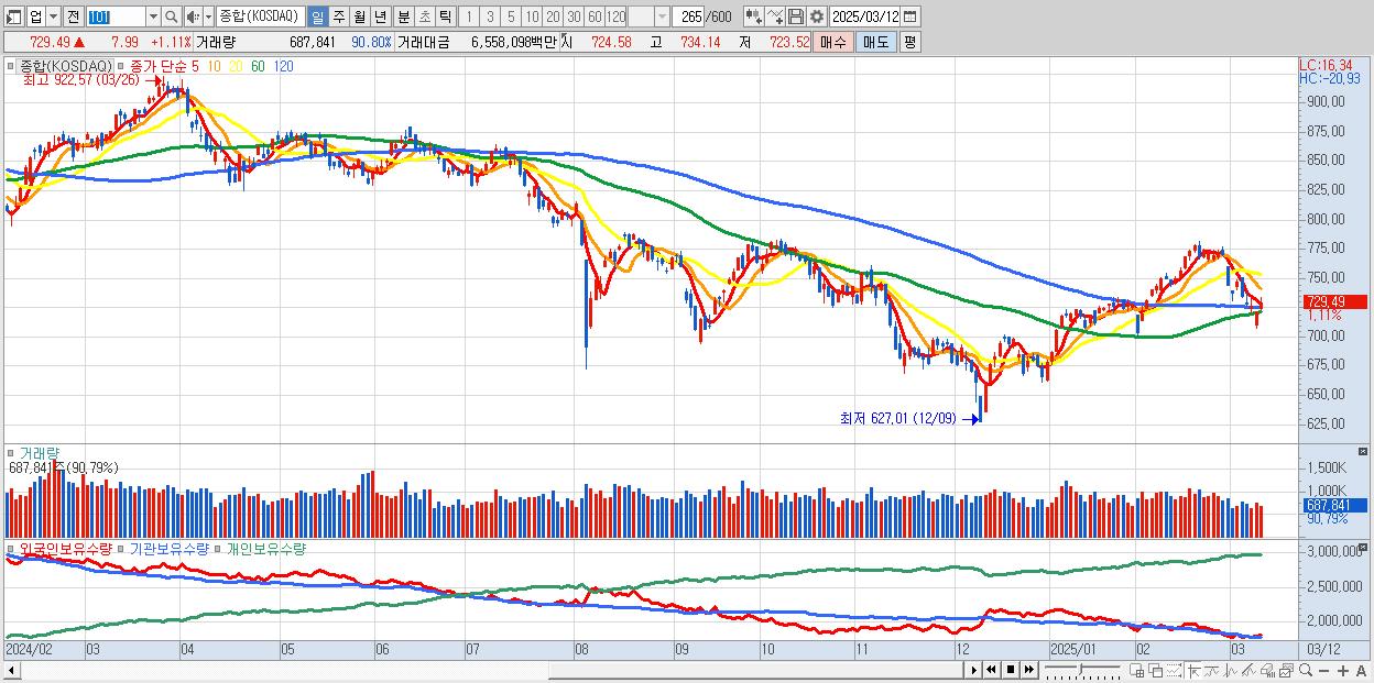 | 03/12 | 729.49 | ▲1.11% | -128억 | 138억 | 93억 | -104억 |