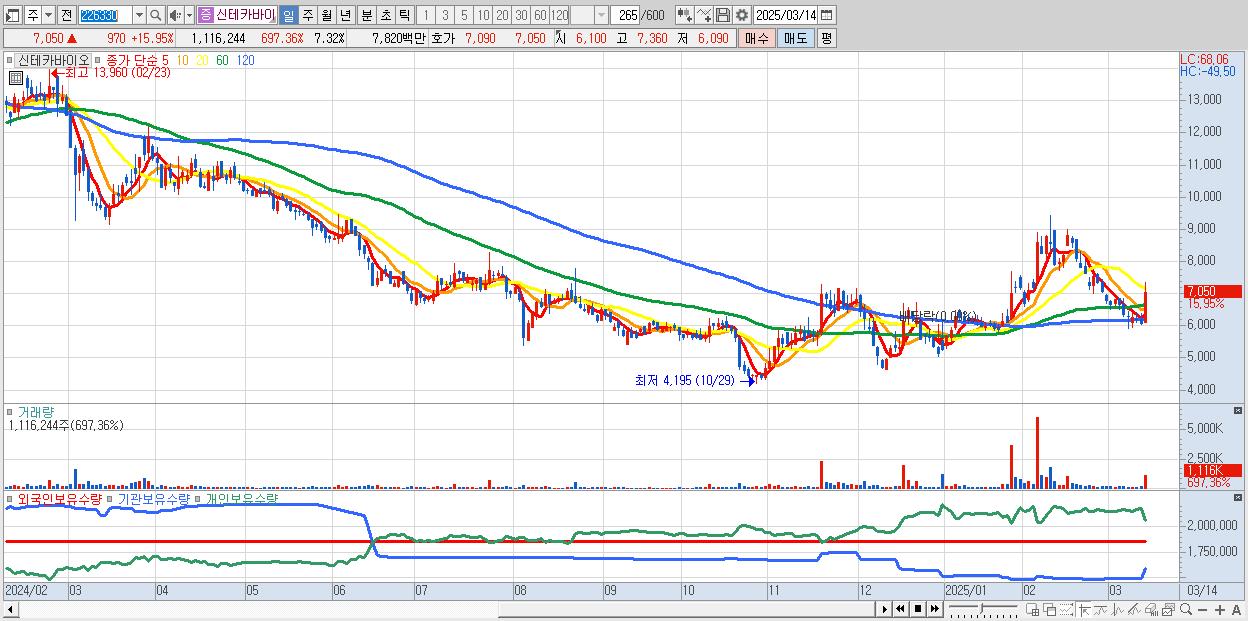 - 신테카바이오 (7,050원 ▲ 15.95% , 시총: 1,076억, 거래량: 1,116,244, 거래대금:78억)