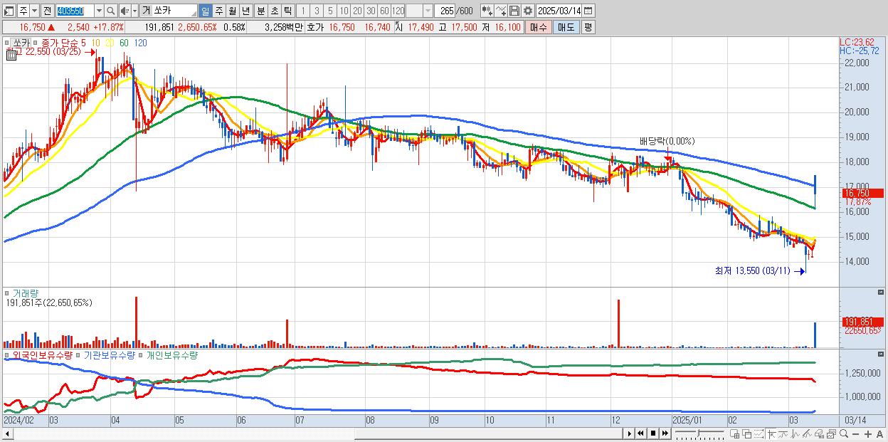 - 쏘카 (16,750원 ▲ 17.87% , 시총: 5,501억, 거래량: 191,851, 거래대금:33억)