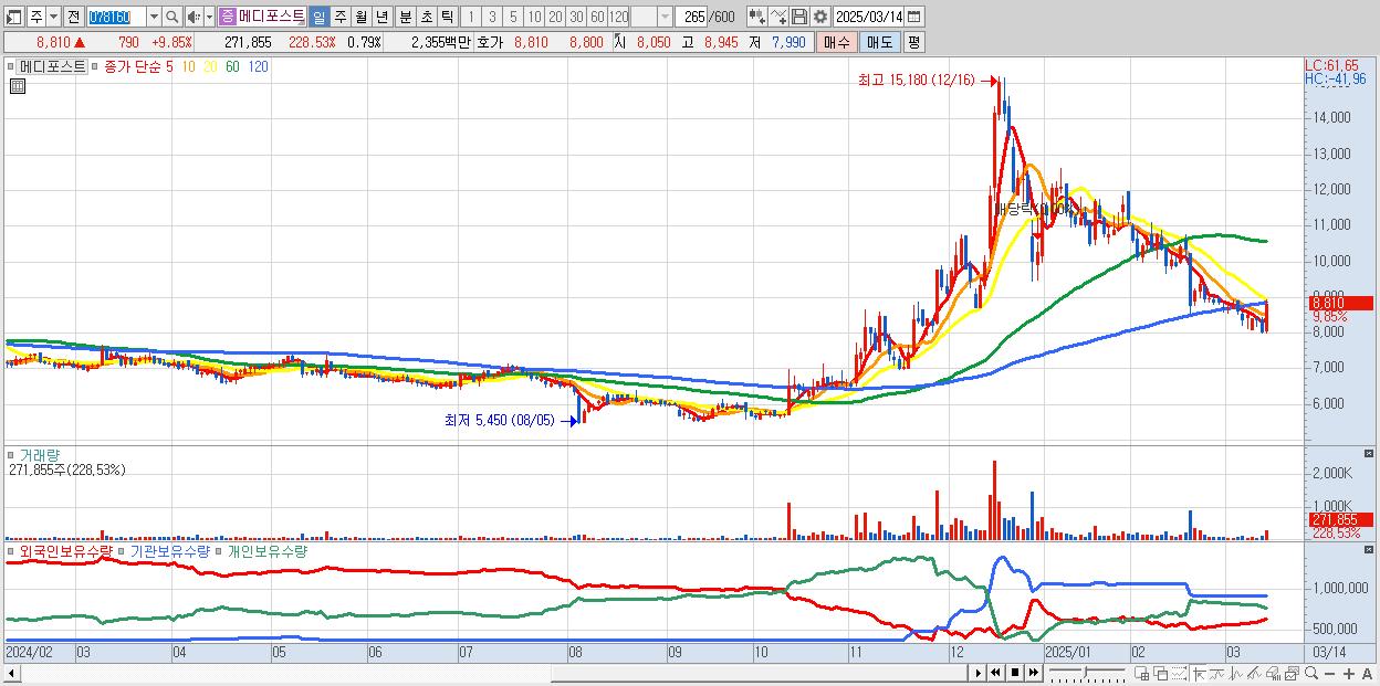 - 메디포스트 (8,810원 ▲ 9.85% , 시총: 3,015억, 거래량: 271,855, 거래대금:24억)