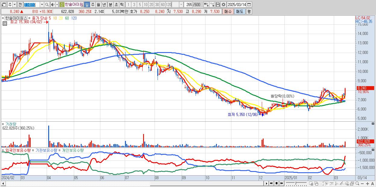- 한솔아이원스 (8,240원 ▲ 10.9% , 시총: 2,399억, 거래량: 622,828, 거래대금:50억)