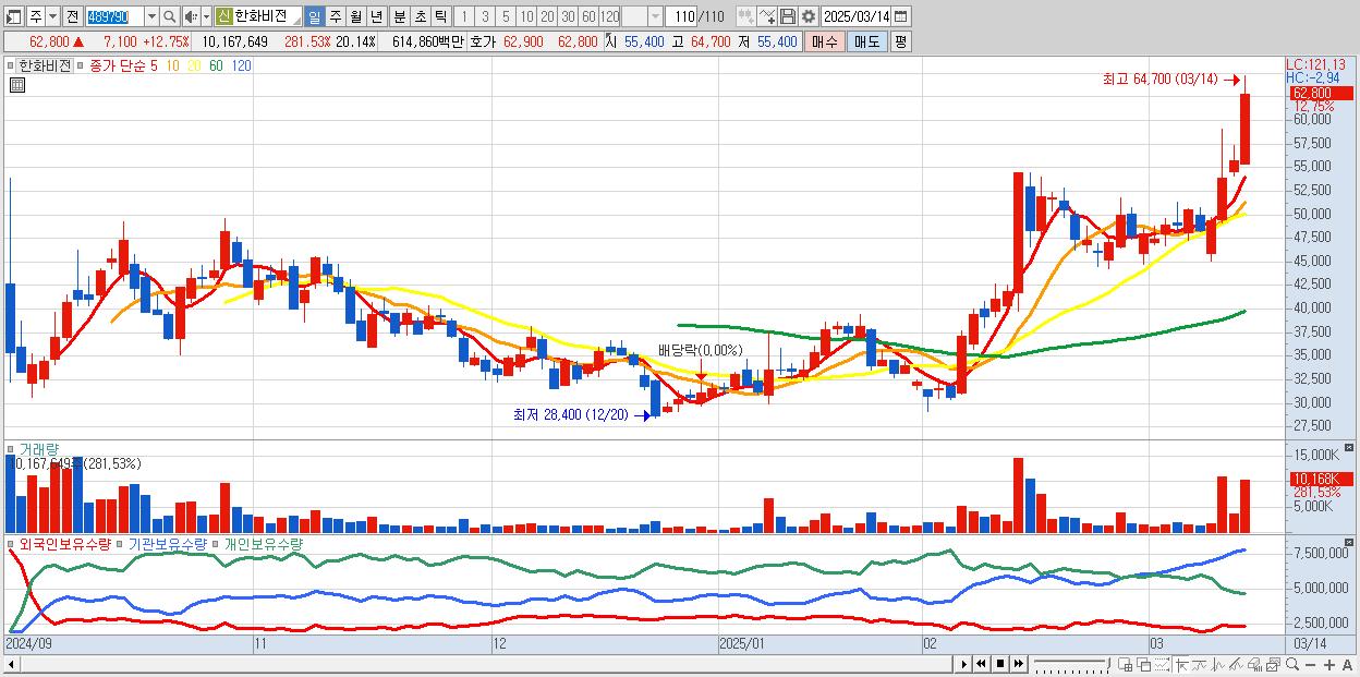 - 한화비전 (62,800원 ▲ 12.75% , 시총: 31,707억, 거래량: 10,167,649, 거래대금:6,149억)