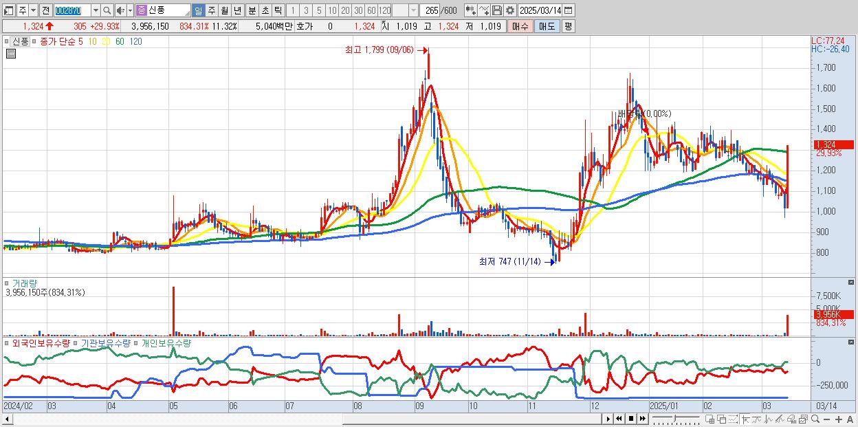 - 신풍 (1,324원 ▲ 29.93% , 시총: 463억, 거래량: 3,956,150, 거래대금:50억)
