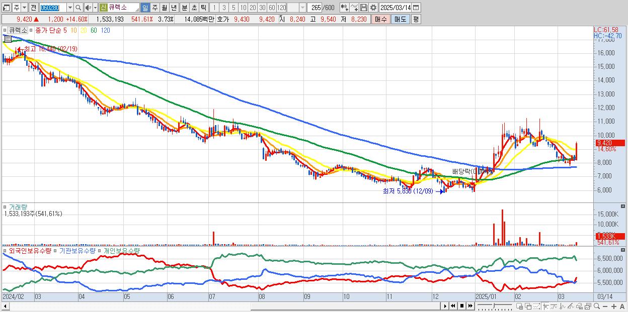 - 큐렉소 (9,420원 ▲ 14.6% , 시총: 3,871억, 거래량: 1,533,193, 거래대금:141억)