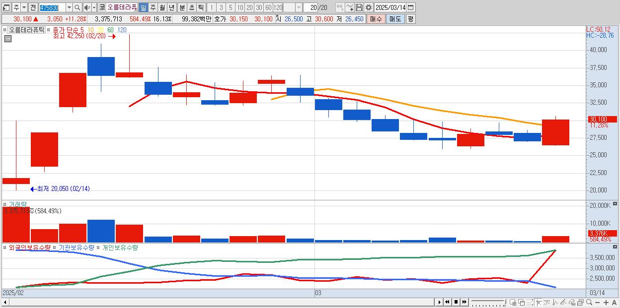 - 오름테라퓨틱 (30,100원 ▲ 11.28% , 시총: 6,300억, 거래량: 3,375,713, 거래대금:994억)