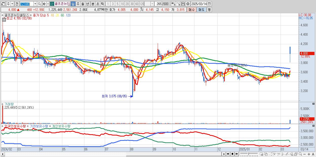 - 골프존뉴딘홀딩스 (4,000원 ▲ 12.99% , 시총: 1,713억, 거래량: 1,225,449, 거래대금:49억)