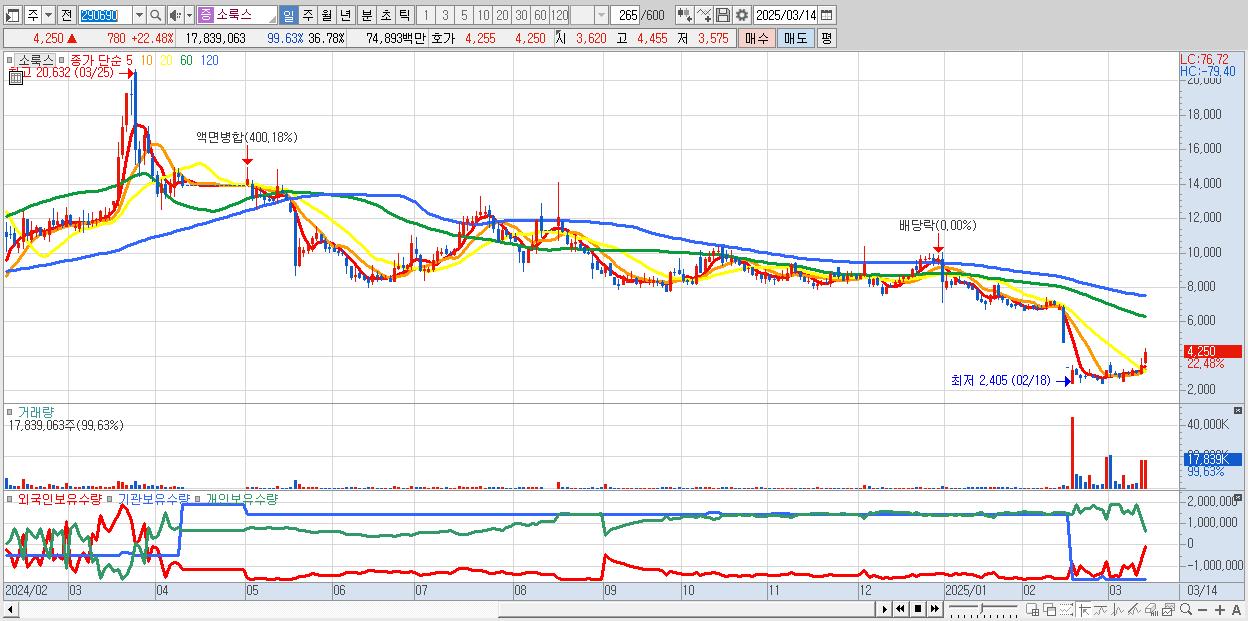 - 소룩스 (4,250원 ▲ 22.48% , 시총: 2,061억, 거래량: 17,839,063, 거래대금:749억)
