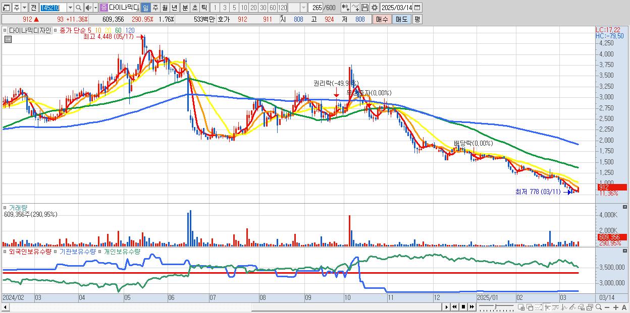 - 다이나믹디자인 (912원 ▲ 11.36% , 시총: 315억, 거래량: 609,356, 거래대금:5억)