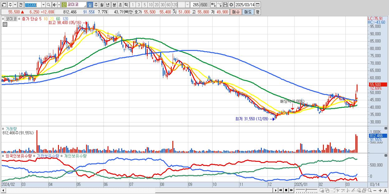 - 코미코 (55,500원 ▲ 12.69% , 시총: 5,806억, 거래량: 812,466, 거래대금:437억)