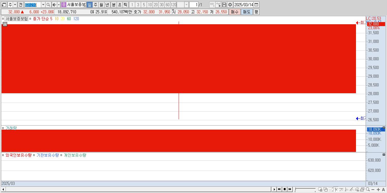 - 서울보증보험 (32,000원 ▲ 23.08% , 시총: 22,343억, 거래량: 18,092,710, 거래대금:5,401억)