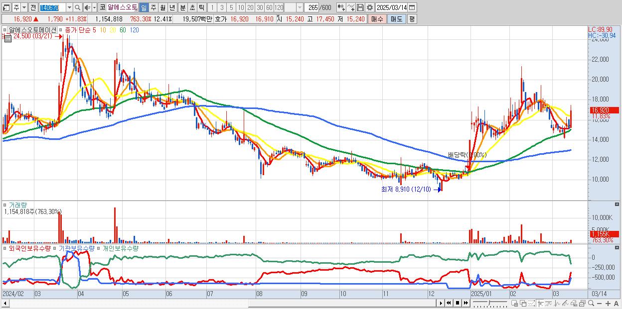 - 알에스오토메이션 (16,920원 ▲ 11.83% , 시총: 1,574억, 거래량: 1,154,818, 거래대금:195억)