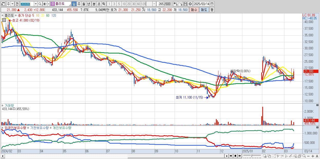 - 플리토 (21,300원 ▲ 12.88% , 시총: 1,172억, 거래량: 433,144, 거래대금:90억)
