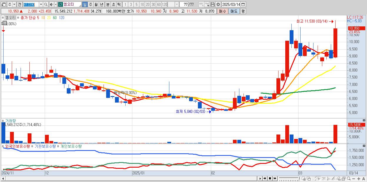 - 엠오티 (10,950원 ▲ 23.45% , 시총: 1,268억, 거래량: 15,549,212, 거래대금:1,681억)