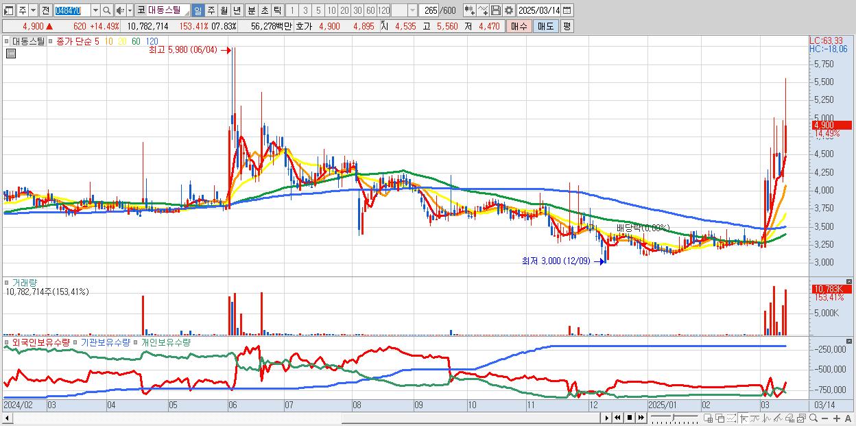 - 대동스틸 (4,900원 ▲ 14.49% , 시총: 490억, 거래량: 10,782,714, 거래대금:563억)