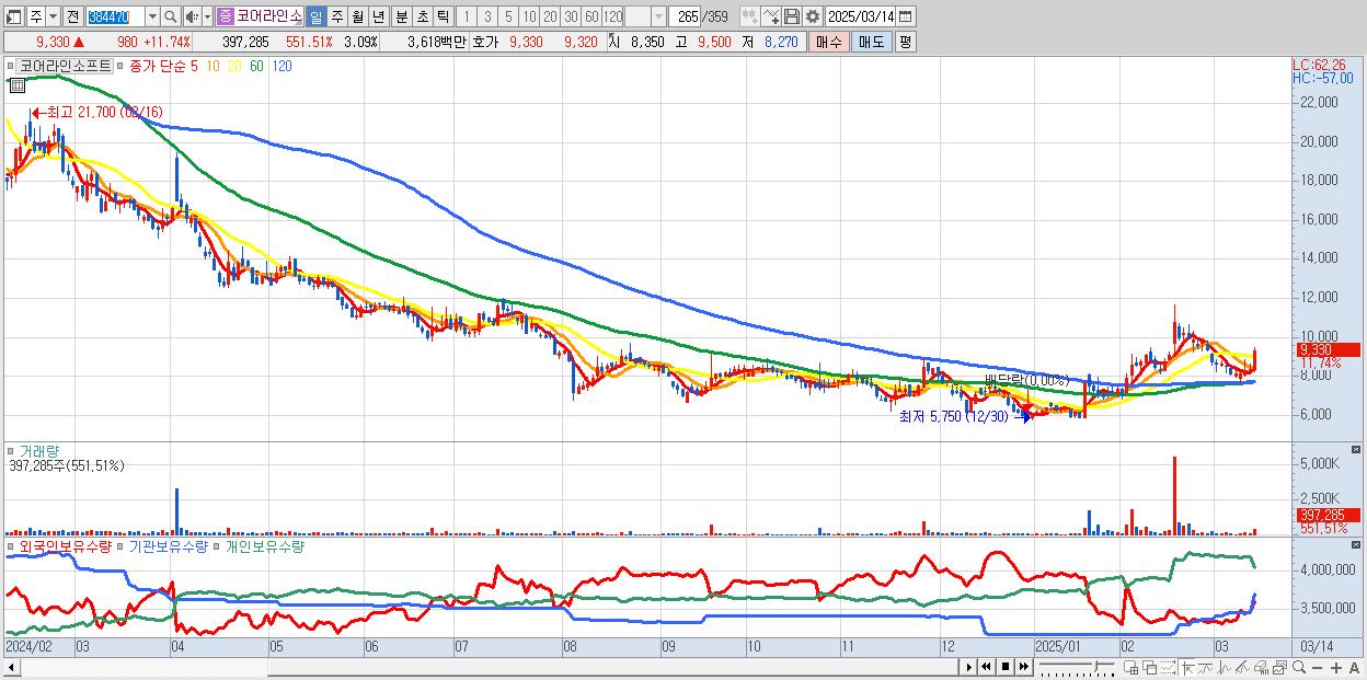 - 코어라인소프트 (9,330원 ▲ 11.74% , 시총: 1,198억, 거래량: 397,285, 거래대금:36억)