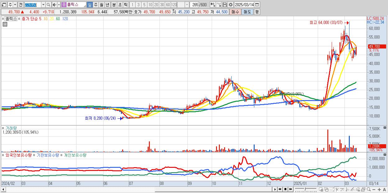 - 올릭스 (49,700원 ▲ 9.71% , 시총: 9,258억, 외국인 순매수 거래금:80억)