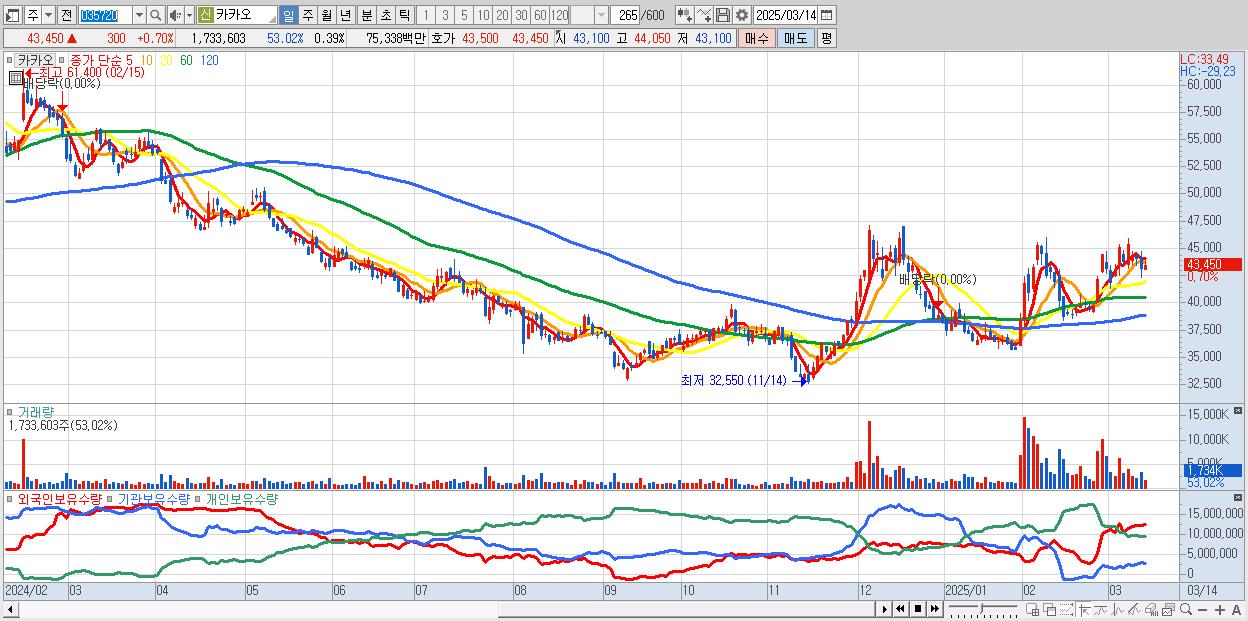 - 카카오 (43,450원 ▲ 0.7% , 시총: 192,797억, 외국인 순매수 거래금:86억)