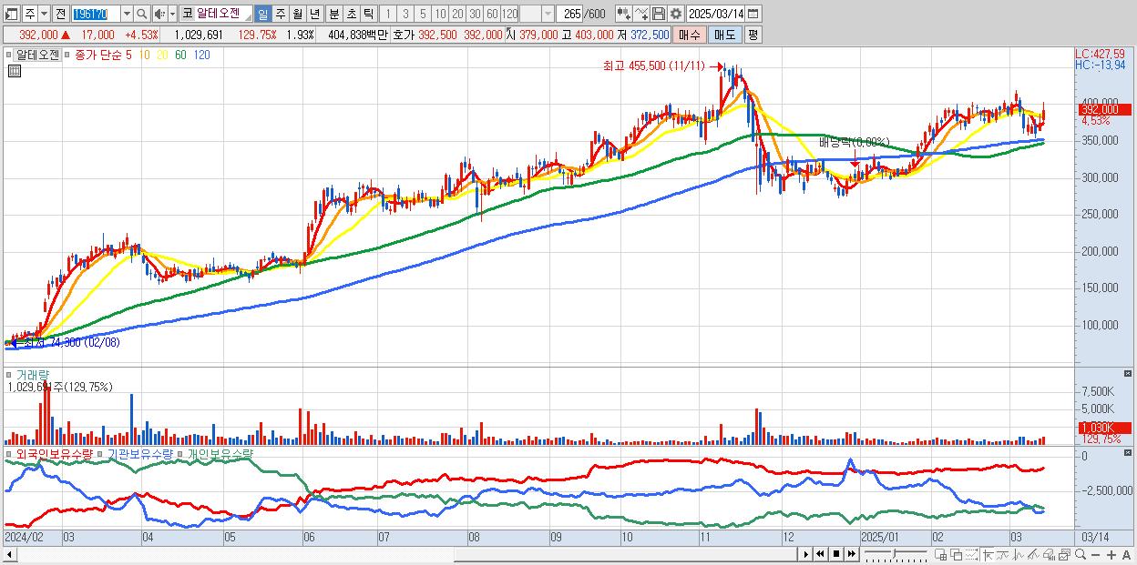 2.알테오젠 392,000원 ▲ 4.53% (KOSDAQ, 196170)