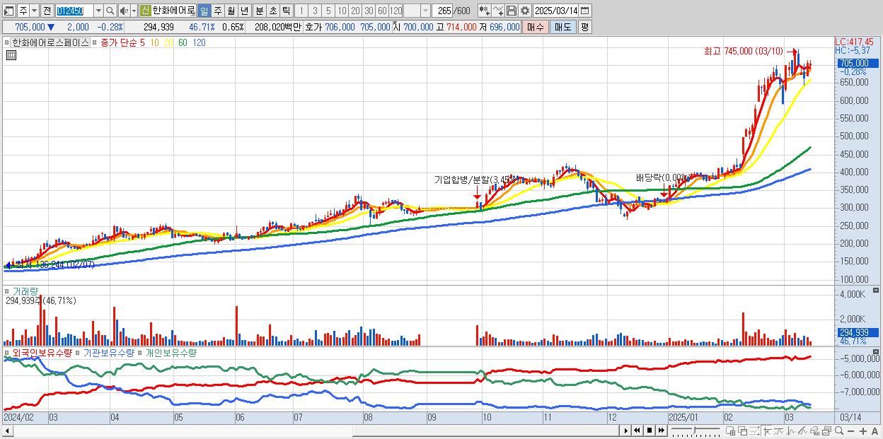 - 한화에어로스페이스 (705,000원 ▼ -0.28% , 시총: 321,347억, 외국인 순매수 거래금:254억)
