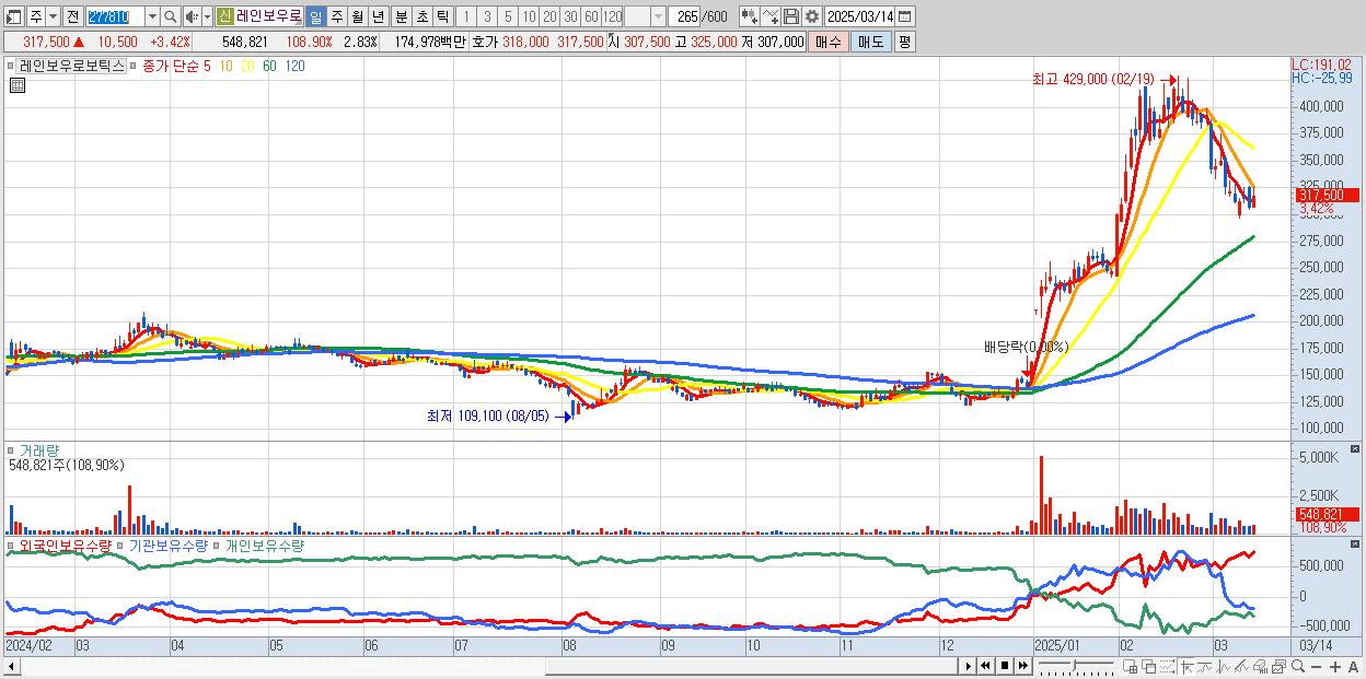 - 레인보우로보틱스 (317,500원 ▲ 3.42% , 시총: 61,595억, 외국인 순매수 거래금:214억)