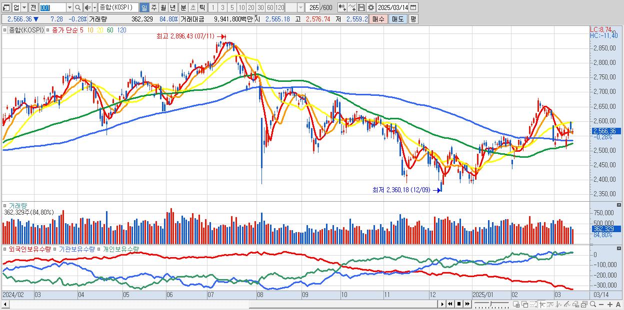 | 03/14 | 2,566.36 | ▼-0.28% | 2,079억 | -2,894억 | -205억 | 1,020억 |
