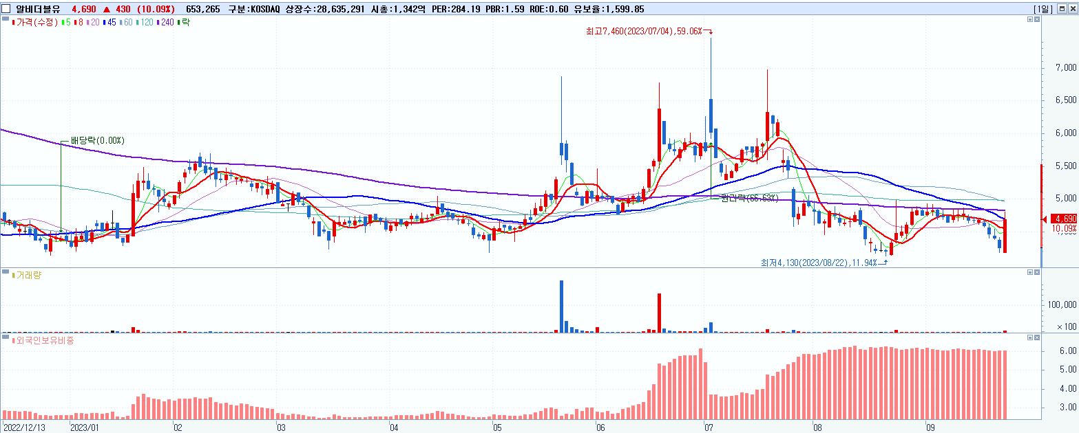 - 알비더블유 (4,690원 ▲ 10.09% , 시총: 1,343억, 거래량: 657,997, 거래대금:30억)
