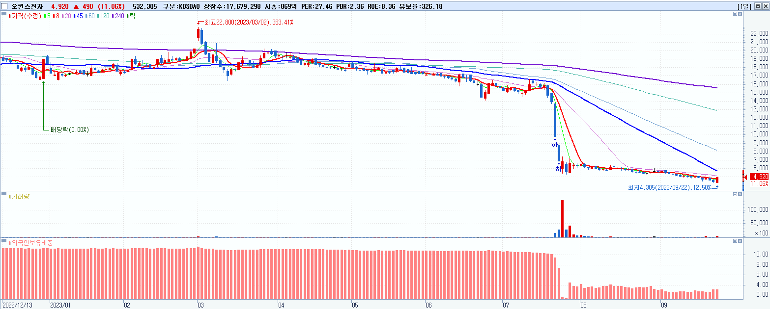 - 오킨스전자 (4,920원 ▲ 11.06% , 시총: 870억, 거래량: 532,953, 거래대금:26억)