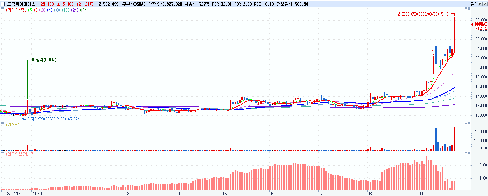 - 드림씨아이에스 (29,150원 ▲ 21.21% , 시총: 1,728억, 거래량: 2,545,830, 거래대금:711억)