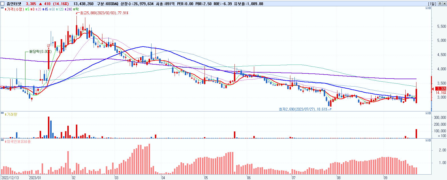 - 줌인터넷 (3,305원 ▲ 14.16% , 시총: 892억, 거래량: 13,471,537, 거래대금:444억)