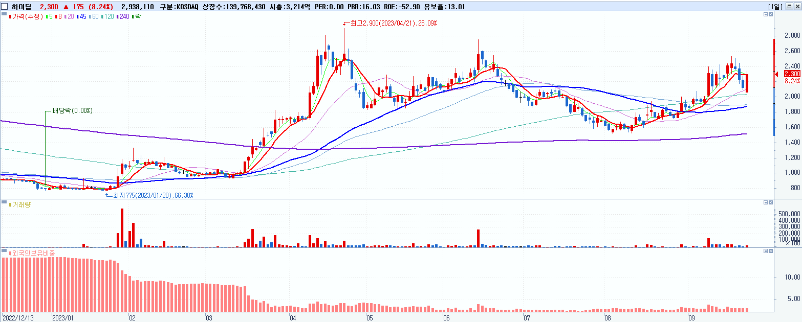 - 하이딥 (2,300원 ▲ 8.24% , 시총: 3,215억, 거래량: 2,961,012, 거래대금:66억)