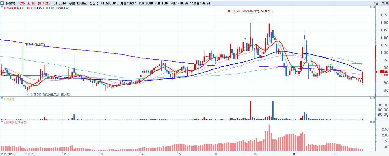 - 뉴보텍 (875원 ▲ 8.43% , 시총: 364억, 거래량: 630,277, 거래대금:5억)