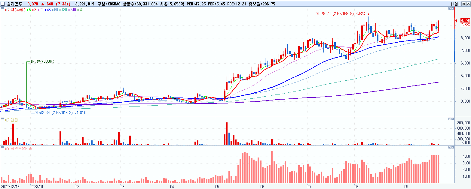 - 실리콘투 (9,370원 ▲ 7.33% , 시총: 5,653억, 거래량: 3,259,044, 거래대금:299억)