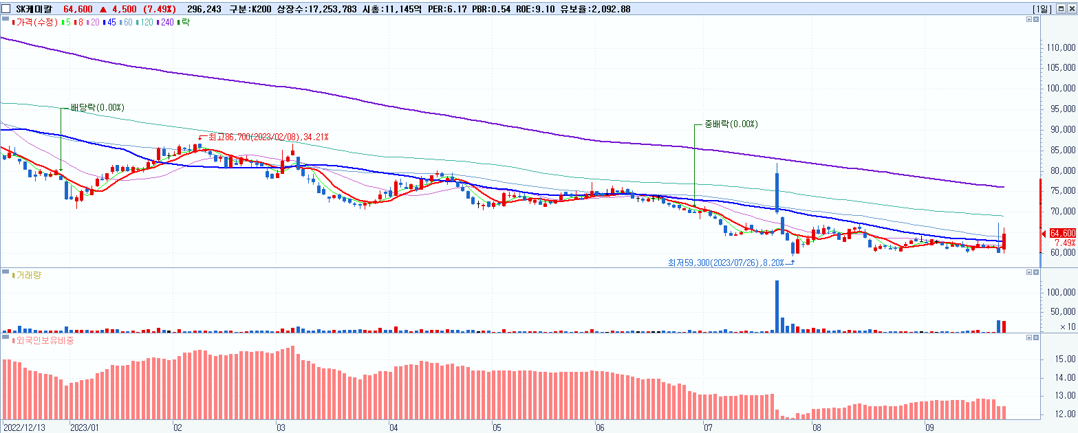 - SK케미칼 (64,600원 ▲ 7.49% , 시총: 11,146억, 거래량: 296,841, 거래대금:189억)