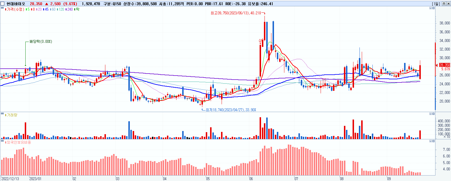 - 현대바이오 (28,350원 ▲ 9.67% , 시총: 11,286억, 거래량: 1,940,130, 거래대금:546억)
