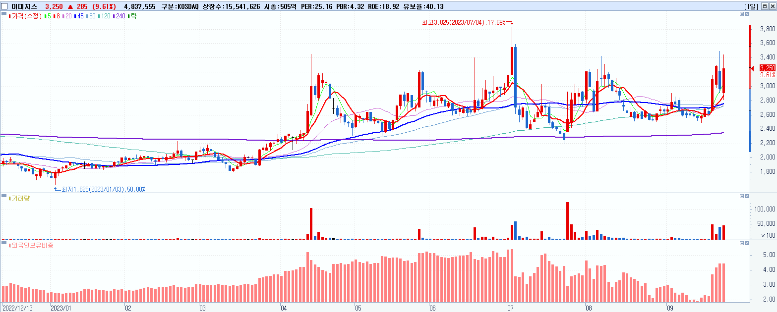 - 이미지스 (3,250원 ▲ 9.61% , 시총: 505억, 거래량: 4,857,920, 거래대금:156억)