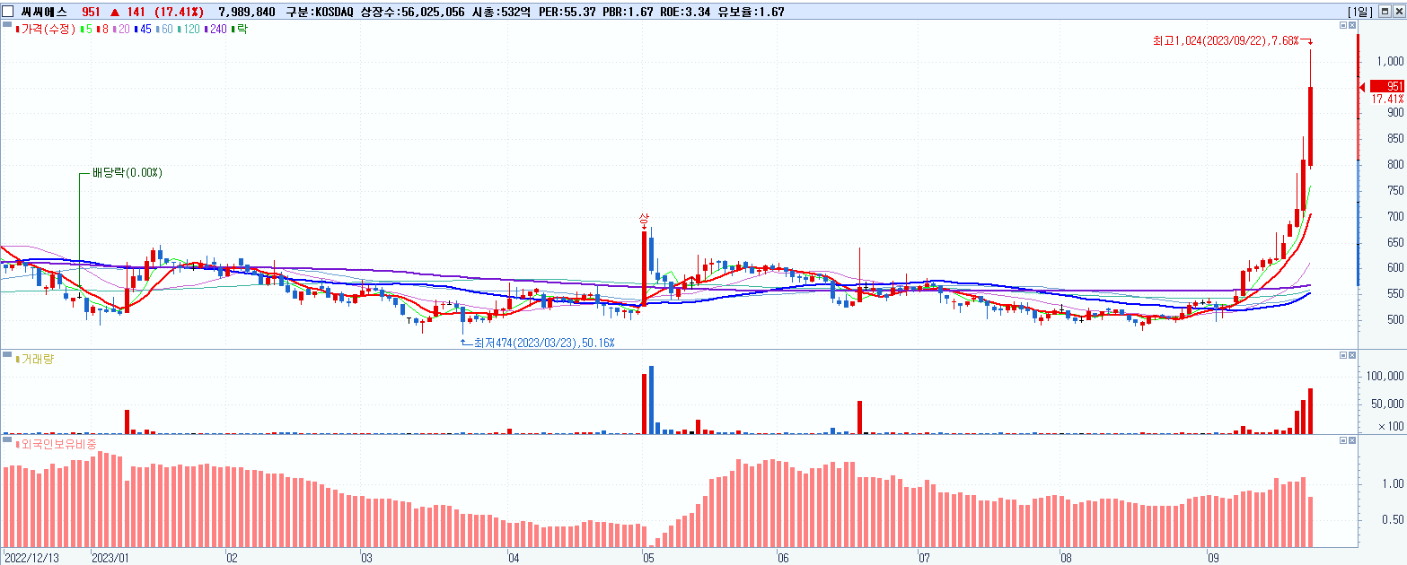 - 씨씨에스 (951원 ▲ 17.41% , 시총: 533억, 거래량: 8,032,533, 거래대금:73억)