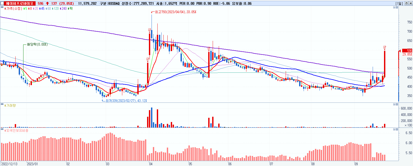 - 에이비프로바이오 (596원 ▲ 29.85% , 시총: 1,653억, 거래량: 11,582,014, 거래대금:66억)