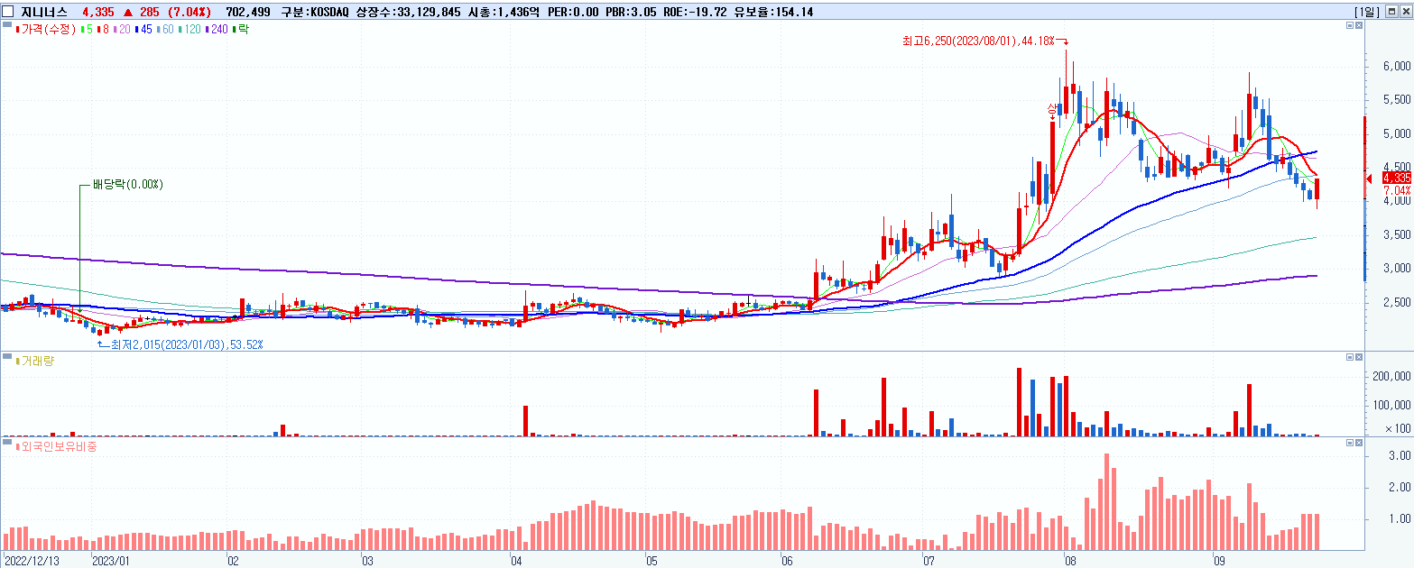 - 지니너스 (4,335원 ▲ 7.04% , 시총: 1,436억, 거래량: 708,833, 거래대금:29억)