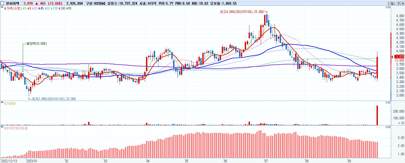 - 윈하이텍 (3,870원 ▲ 13.66% , 시총: 416억, 거래량: 2,957,670, 거래대금:112억)