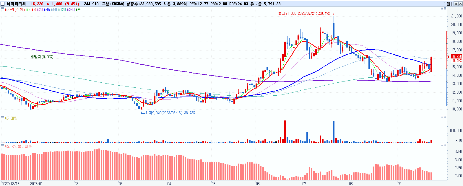 - 에이피티씨 (16,220원 ▲ 9.45% , 시총: 3,890억, 거래량: 246,135, 거래대금:39억)