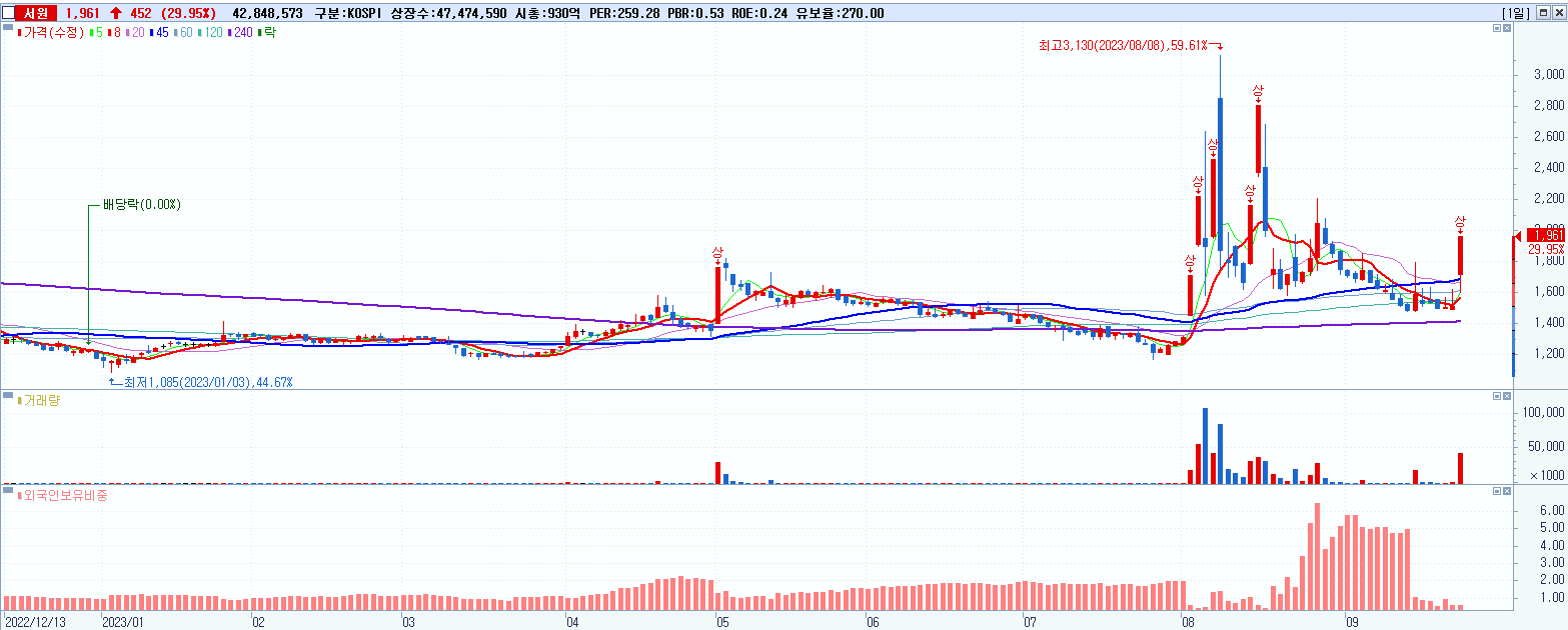 - 서원 (1,961원 ▲ 29.95% , 시총: 931억, 거래량: 43,189,593, 거래대금:793억)