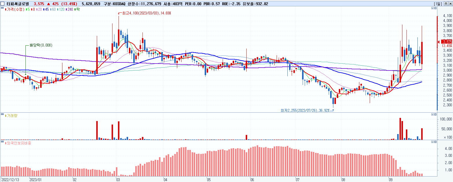 - 티피씨글로벌 (3,575원 ▲ 13.49% , 시총: 403억, 거래량: 5,640,151, 거래대금:205억)